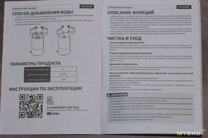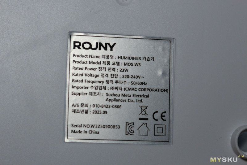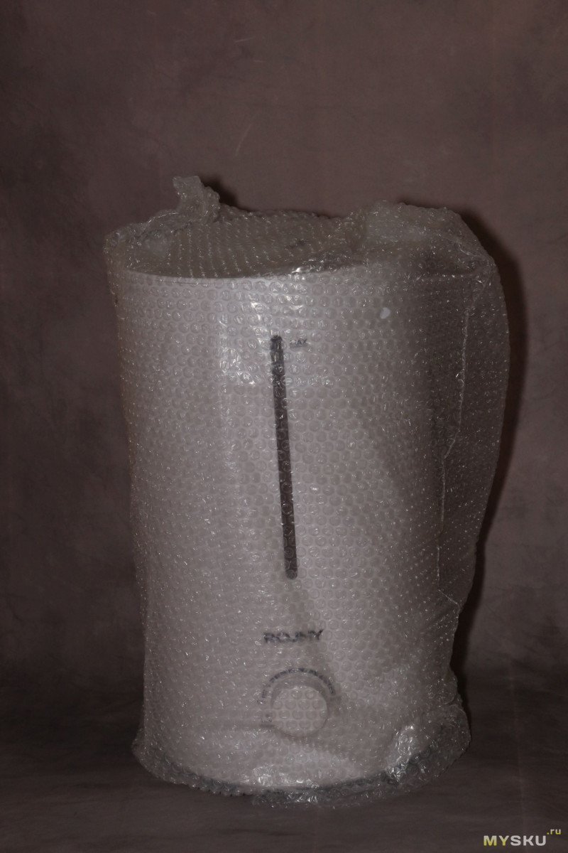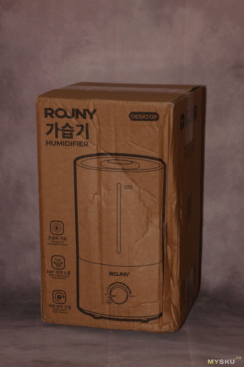Увлажнитель ROUNY MOS W3 приехал в коробке из переработанного картона, дополнительно был обмотан в пакет из пупырки. Не помешали бы прокладки из пенопласта, но и так устройство пришло целым.