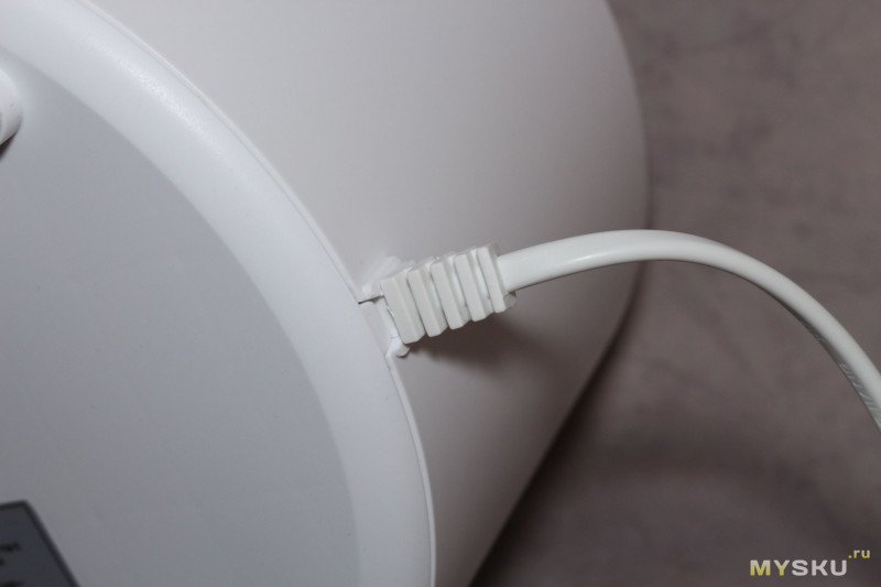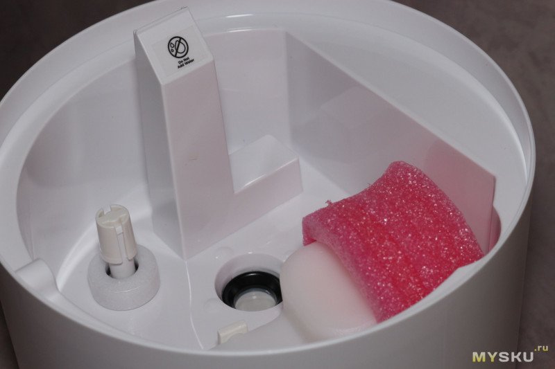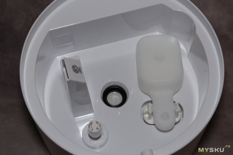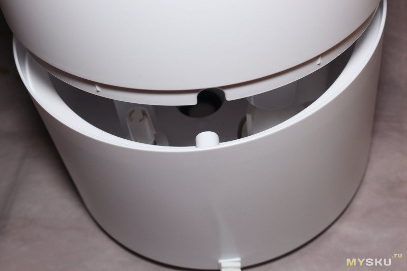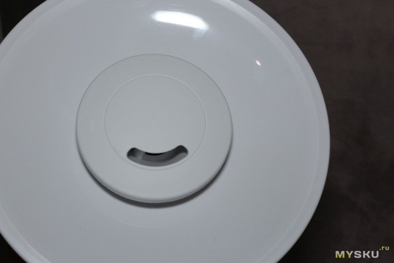 Крышка с вращающимся диффузором — можно направить струю пара в нужную сторону (снова привет Xiaomi, где щель для выхода пара просто прорезана в корпусе — хотите перенаправить струю, вращайте весь увлажнитель). Также крышка сконструирована так, что для дозаправки увлажнителя водой, ее даже снимать не надо — можно лить на крышку, а вода сливается в бак через прорези под диффузором.