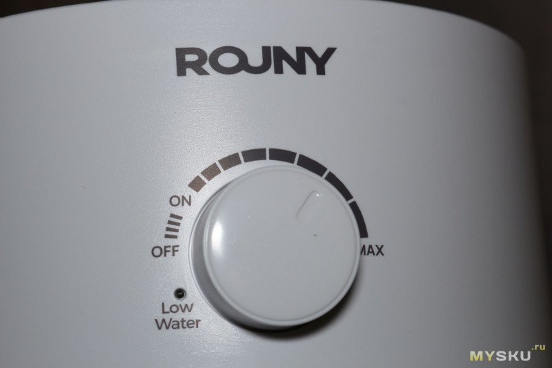 Управление увлажнителем производится одной крутилкой — и включение/выключение, и регулировка мощности. Рядом видно отверстие светодиода — во время работы он светится зеленым, а если устройство отключилось по низкому уровню воды, то красным.