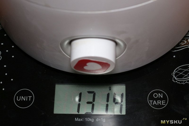 Если судить по весам, за час работы в максимальном режиме увлажнитель расходует 300 мл воды (чуть не дотянул до заявленных 350 мл/ч), чего достаточно, чтоб держать влажность в комнате площадью 12 м2 с высотой потолка 2,65 м на уровне 40-45% при включенном отоплении и морозе больше -10 С за окном.