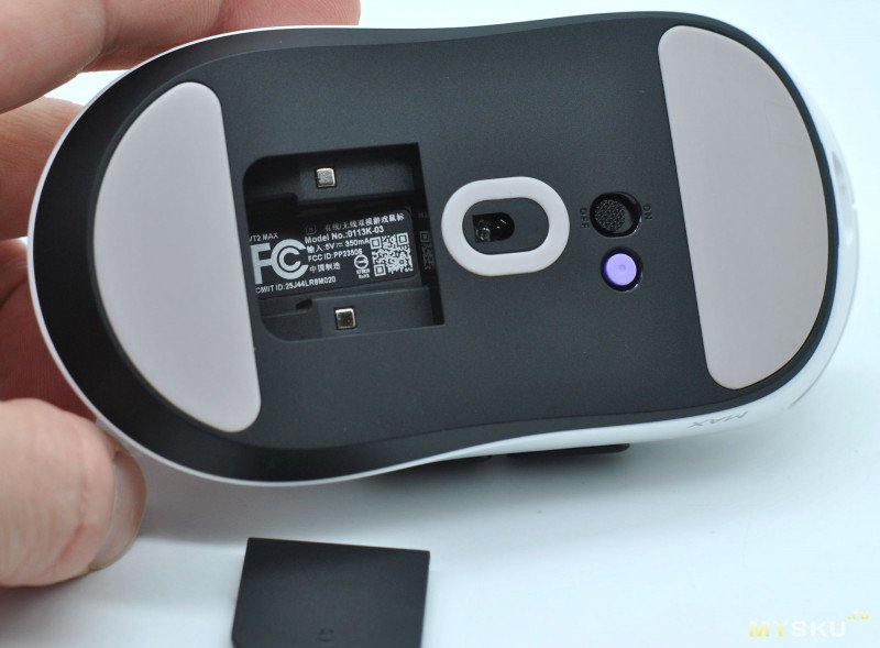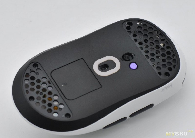 Скользит VT2 MAX великолепно, три тефлоновых накладки, причем одна вокруг окна сенсора, этому способствуют. Снизу еще выключатель и дополнительная настраиваемая кнопка.Магнитный отсек на дне — для хранения USB‑ресивера при переноске, там же контакты зарядки для опциональной станции.