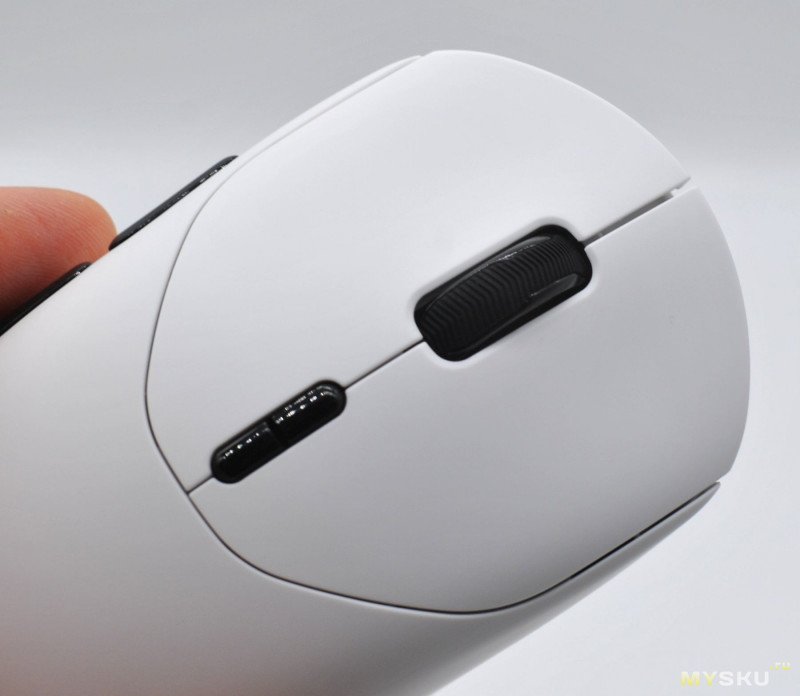 ЛКМ и ПКМ отделены от корпуса прорезью (между ними кнопки DPI), колесико прокрутки с резиновой покрышкой: