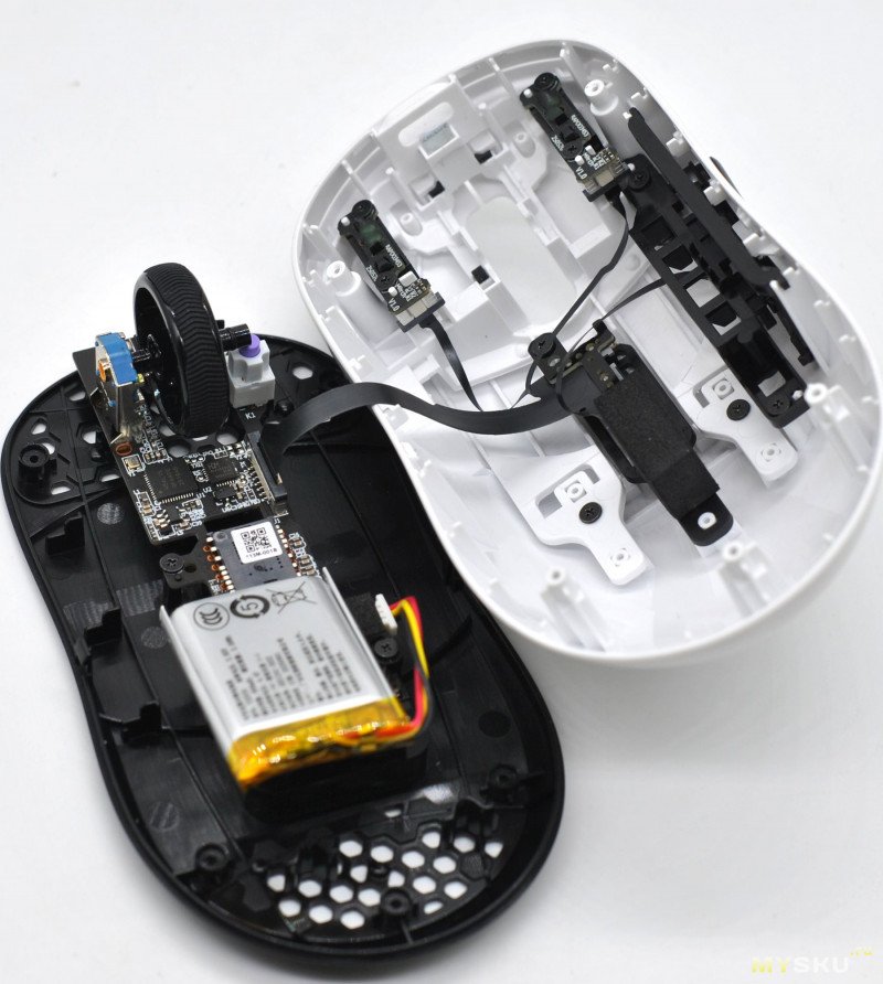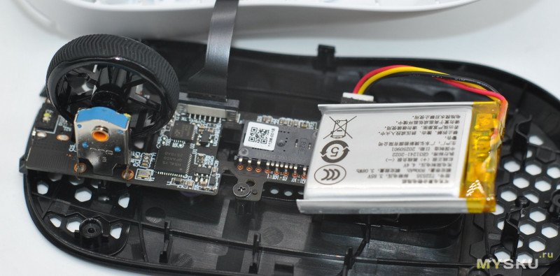 Кнопки (оптический механизм на основных) в верхней части подключены к плате снизу при помощи шлейфа. Колесико механика. Аккумулятор 800 мАч (3,08 Втч).