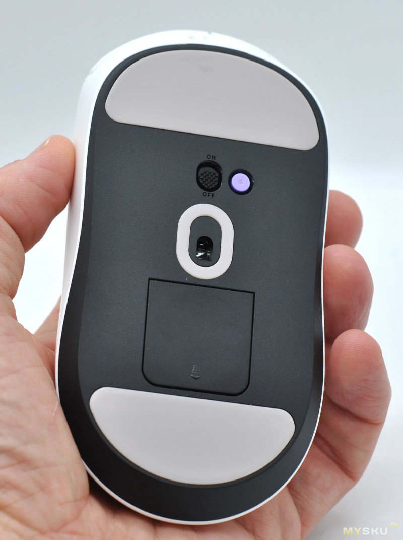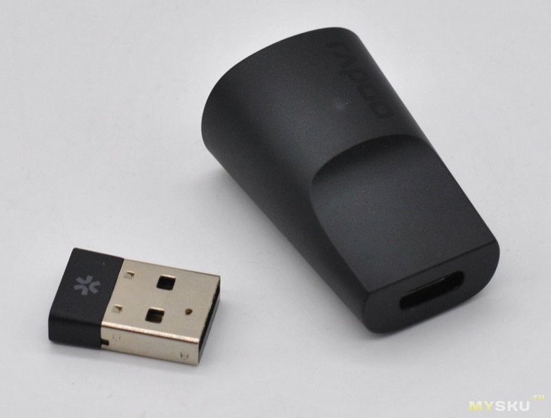 Но и без них матовый пластик мыши довольно цепкий.Адаптер 2,4 ГГц (с ярким зеленым индикатором) для беспроводного подключения и переходник (на Type-C) для него: