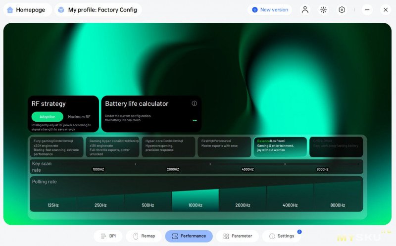 Производительность. Здесь можно настроить частоту опроса сенсора (от 125 до 8000 Гц с шагом). Высокая частота опроса (до 8000 Гц) обеспечивает минимальный отклик, но увеличивает расход заряда батареи (запас упадет до 120 часов). Также в этой вкладке доступен расчёт примерного времени работы от аккумулятора при выбранных настройках.
