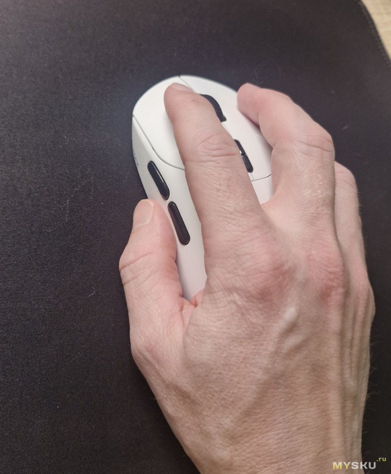 Мышь выполнена в симметричном корпусе (в отличие от VT3 MAX) с гладкими гранями, что делает её удобной для разных типов хвата — от ладонного до пальцевого. Однако из‑за расположения боковых кнопок слева модель больше подходит правшам. Корпус с матовым пластиком (не собирает отпечатки) жесткий и не скрипит, чего не ожидаешь от такой малой массы.