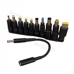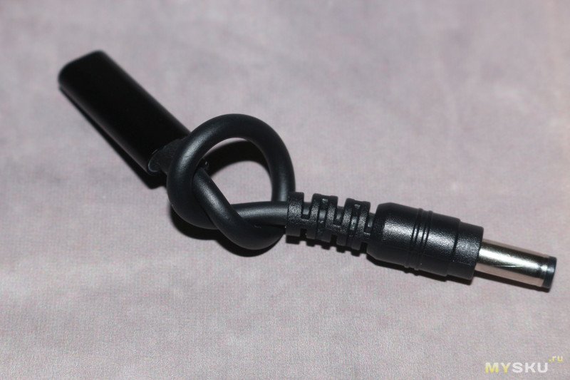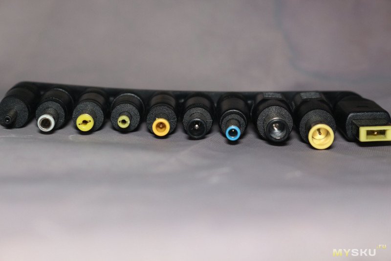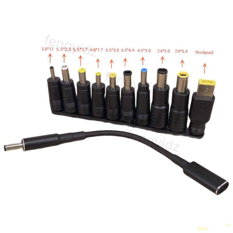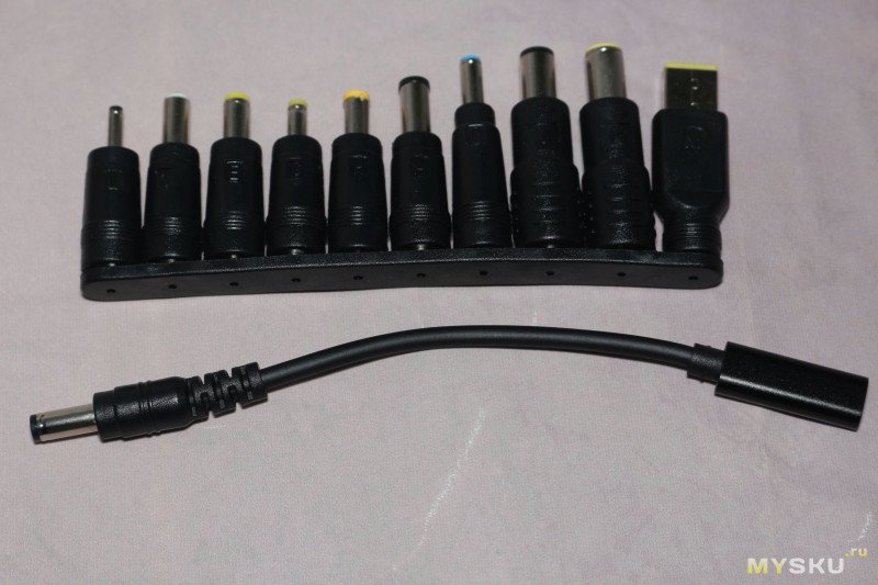 Комплект представляет собой шнурок с разъемами USB-C и DC 5.5*2.1 мм на разных концах, с PD триггером на 20 в; и набор переходников с 5.5*2.1 на другие размеры.