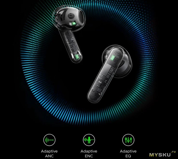 》Адаптивное активное шумоподавление ANC+ENC ~52 дБ (6 микрофонов с AI, по факту по 2 на наушник, плюс разговорные)