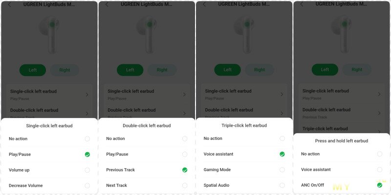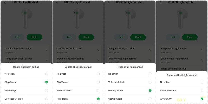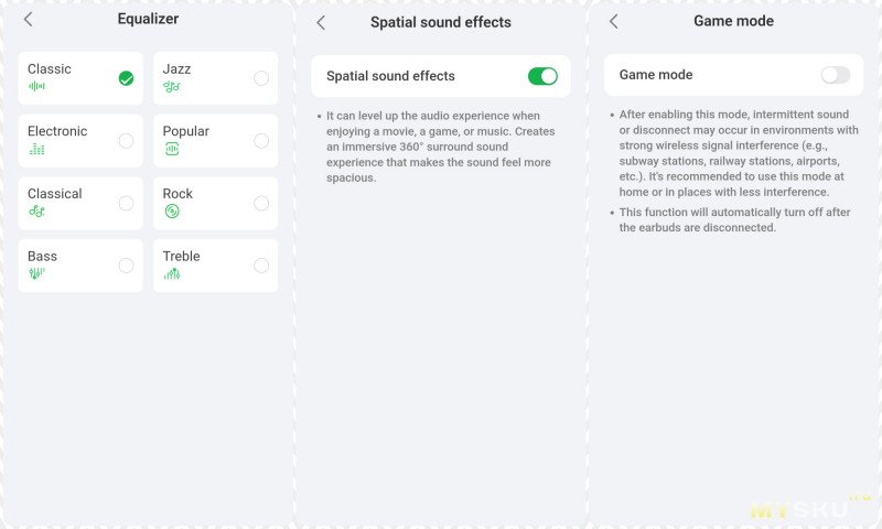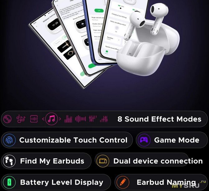 можно настроить яркость, поиск наушника, эквалайзер, игровой режим или окружающий звук, шумодав, громкост, управление плеером, время отключения экрана