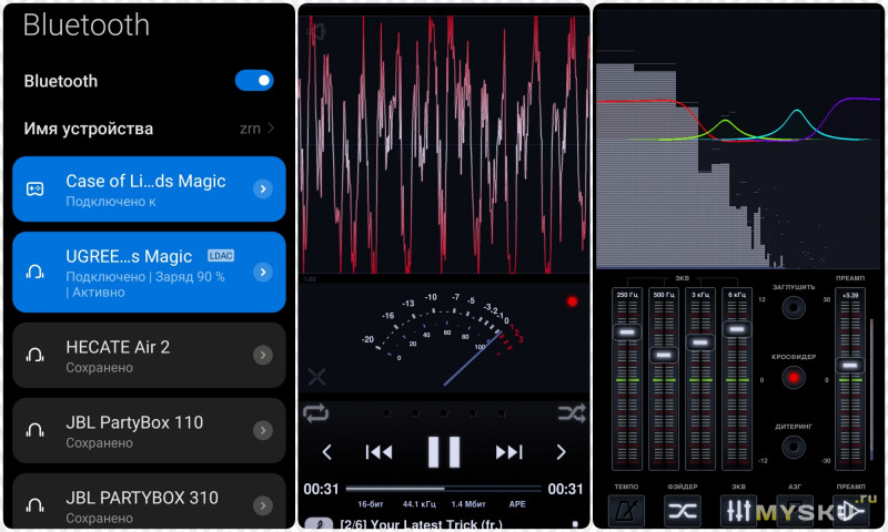 Что услышал. Наушники с довольно плотным низом, но не мясным. Ниже добавлю ещё скрины что накручивал эквалайзерами, запас до перегруза имеется, но физически реализовать супер-басс всё-равно не получится. Уж такая конструкция и характеристики. Но басят (и без эквалайзеров).