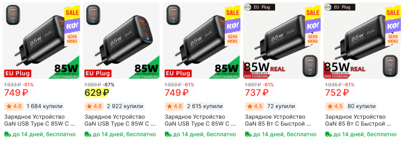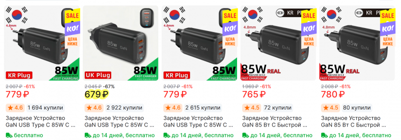 Еще одно недорогое и сравнительно мощное зарядное устройство с тремя выходами, пара type-C и одним A. 85Вт у него заявлены суммарные, максимум одного порта 65Вт. Сейчас с нормальными вилками кончились.
