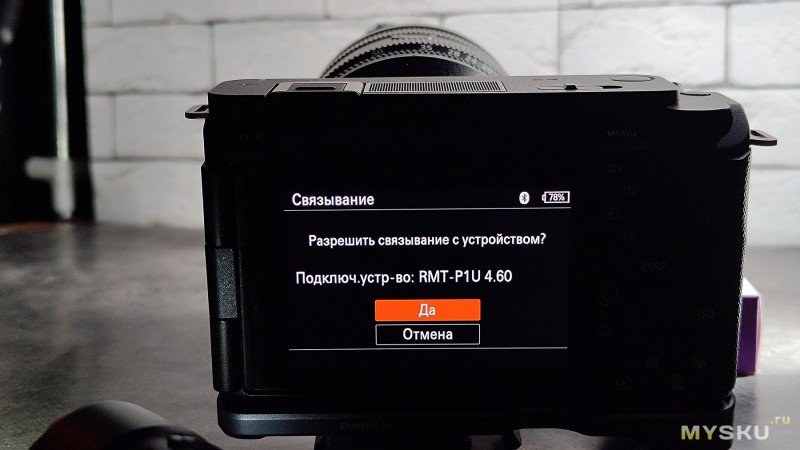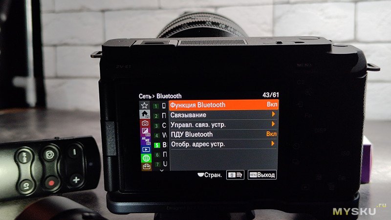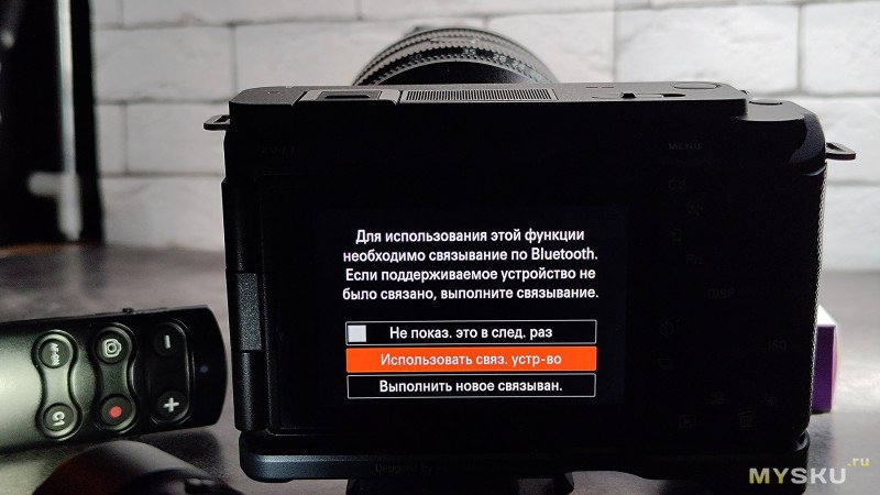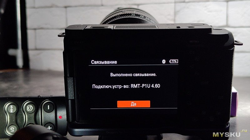 Для сопряжения пульта с камерой, зайти в настройки камеры в раздел «Сеть -> Bluetooth -> Функция Bluetooth — > вкл.», затем в «Сеть -> Bluetooth -> Связывание -> Выполнить новое связывание». На пульте тем временем зажать и удерживать на пару сек кнопки «Сделать фото и (+)»