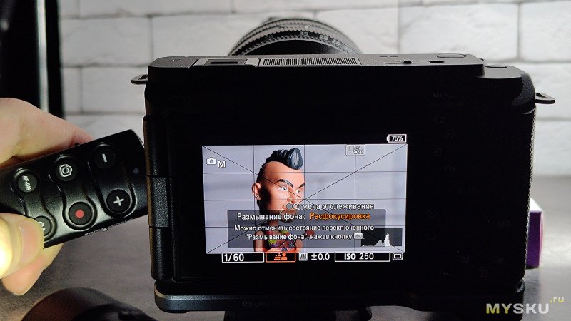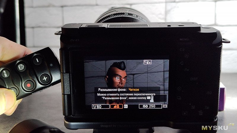 Кнопка C1 в моей камере по умолчанию настроена на включение/выключение быстрого размытие фона за счёт авто-регулировки диафрагмы — я эту функцию переназначу на что-то другое, но пока проверим так. Тоже работает.
