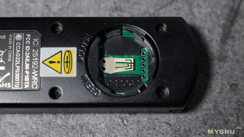 На обратной стороне отсек для батарейки и наклейка с инфой о модели пульта и необходимом напряжении батарейки.