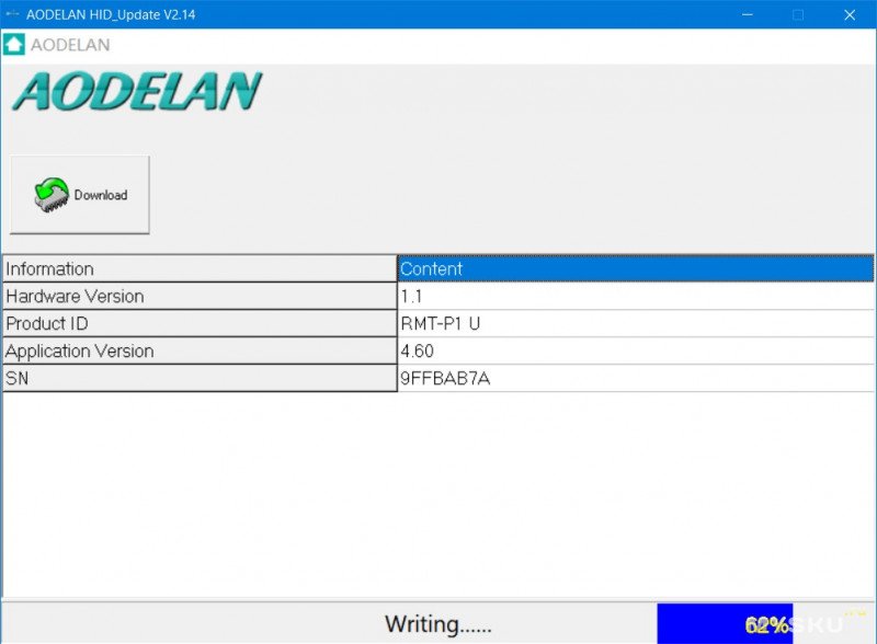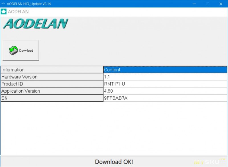 В инструкции даёт сайт aodelan.net, с которого нужно скачать инструменты для обновления прошивки из раздела «поддержка». Внутри скачанного архива прошивальщик и bin-файл прошивки. Сам пульт с установленной батарейкой нужно подключить к USB-C порту ПК. Окно прошивальщика простое, и содержит инфо об пульте и единственную кнопку выбора файла прошивки. Процесс прошивки занимает несколько секунд, внизу прогресс-бар с процентами.