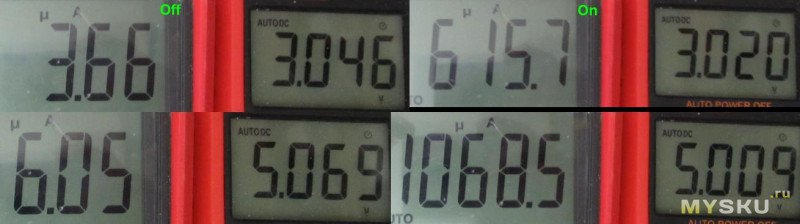 В итоге общее потребление в выключенном состоянии от заряженной батареи составило меньше 10мкА, что сравнимо с ее саморазрядом.