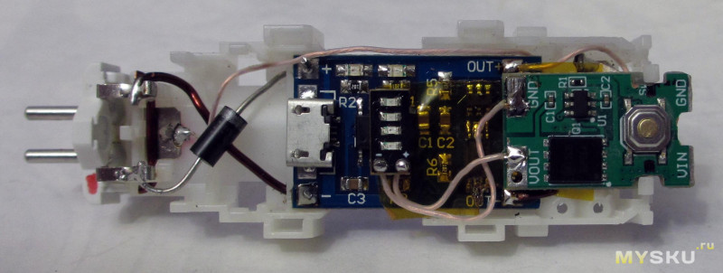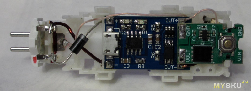 Кроме того этот индикатор полностью гаснет ниже 3.0-3.4В, а bms блокирует работу ниже ~2.52В, когда индикатор уровня уже давно погас.В отличие от родной платы нет блокировки работы во время заряда. Но если разрядить полностью, до защиты — когда эта возможность и востребована, то от сети побрится не получается, ибо заряд до напряжения ~2.8В происходит малым током (100мА), которого на движок не хватит. Если до такого не доводить, то совмещать можно.