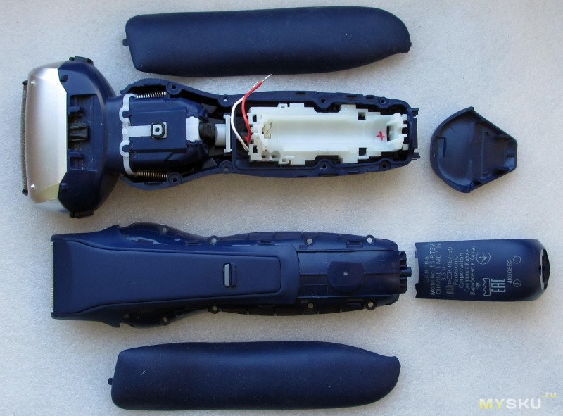 Теперь займемся бритвой. Разбирается она — сдвигается панель сзади, зафиксированная на одном шурупе