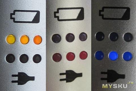 Из недостатков — диоды индикации на плате tp4056 расположена не вполне удачно относительно «окон» в корпусе, и красный диод видно разве что в темноте под углом, синий видно получше, но тоже не очень (нижний ряд). Диоды индикатора уровня заряда видны все вместе, т.е. ориентироваться можно только по цвету (верхний).