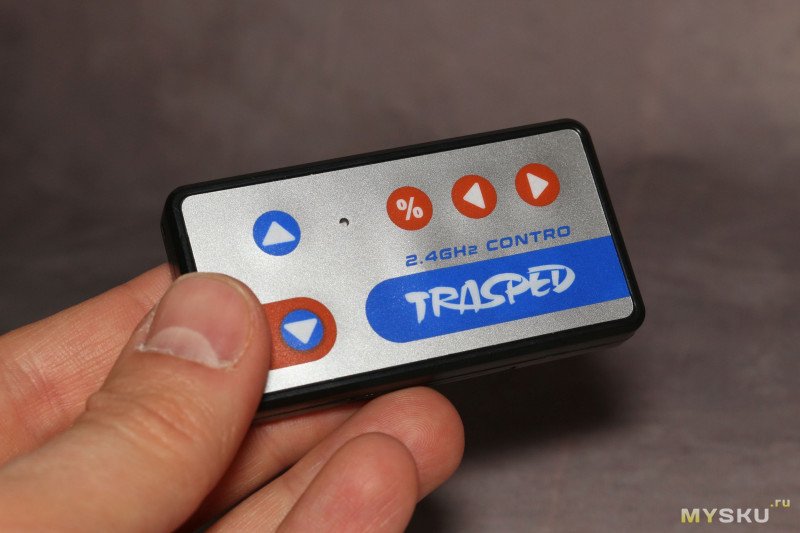 Под стать ей и пульт — его можно засунуть даже в зажигалочный карман джинсов. При этом кнопки достаточно го размера, чтоб даже взрослый мог управлять без дискомфорта. Кнопка “%” отвечает за переключение скоростей — всего их 3, и на третьей машинка становится реально сумасшедшей.