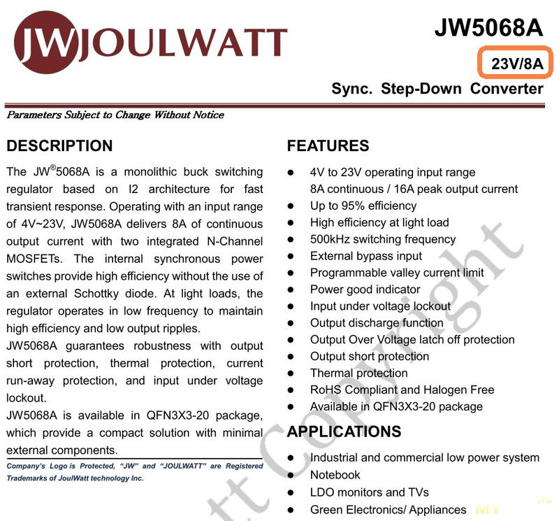 Преобразователь с максимальным током 6 А, характеристики и описание гораздо лучше соответствуют поведению распаянной в модуле микросхемы, да и внешний вид похож. По распиновке чип совместим с JW5068A.
