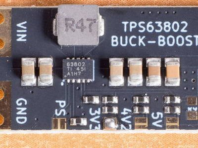 По входу есть предохранитель и TVS-диод, микросхема преобразователя закрыта радиатором. По выходу стоит красный индикаторный светодиод. Подстроечника для установки выходного напряжения здесь нет, варианты со стандартными напряжениями 3,3, 5, 9 и 12 вольт выбираются при заказе; напомню, на обзоре модуль на 5 вольт.