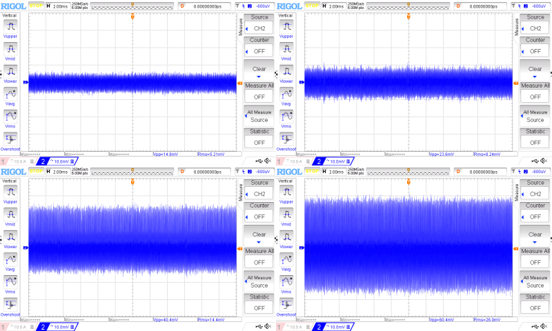 Шум и пульсации измерялись с помощью экранированного кабеля, подпаянного к выходным площадкам. Вначале при входном напряжении 12 В и нагрузке 0, 1, 3 и 6 ампер:
