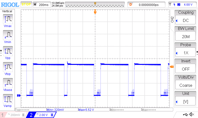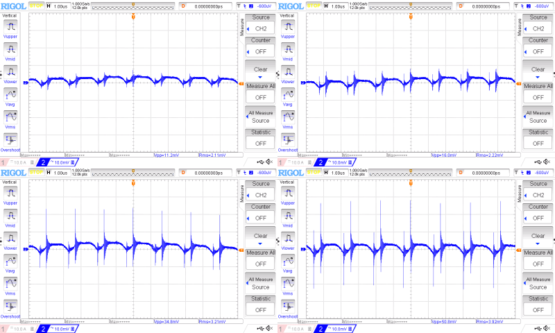 Уровень пульсаций невысокий, даже с учетом «звона» размах под нагрузкой около 40 мВ от пика до пика, на малых нагрузках менее 10 мВ. По осциллограммам видно, что частота переключения преобразователя составляет около 600 кГц и не зависит от нагрузки.