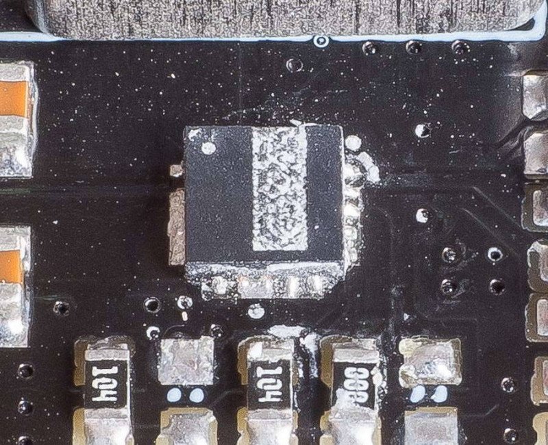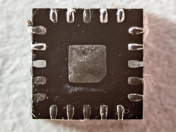 Чип в QFN корпусе с 20 выводами, маркировка стерта лазером. Внешних повреждений не видно. Маркировка первого вывода на плате не совпадает с маркировкой на чипе: