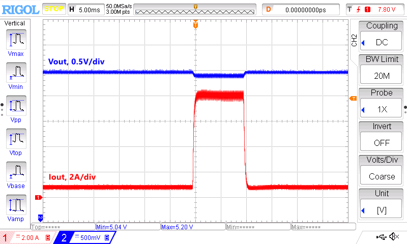 Переходной процесс при скачке тока нагрузки от 0,8 до 8 А и обратно (10%-100%-10%), выглядит очень хорошо, выбросов не видно:
