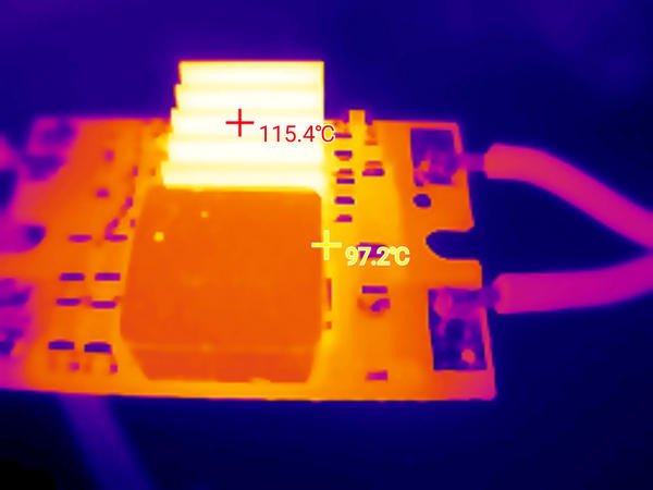 Проверка теплового режима, при входном напряжении 12 вольт и токе нагрузки 4 ампера нагрев умеренный, радиатор разогревается до примерно 85°. При 5 А плата раскаляется до 90-100°, радиатор до 115°, это практически предельные температуры, но защита еще не срабатывает: