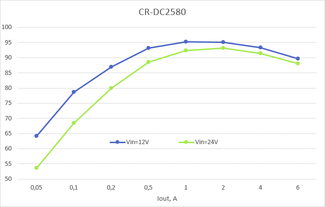 КПД невысокий на малых токах, с увеличением нагрузки растёт и достигает очень приличного значения в 95%. КПД выше при небольшой разности напряжений между входом и выходом; также есть зависимость от температуры — у прогретого модуля КПД примерно на 0,5% ниже.