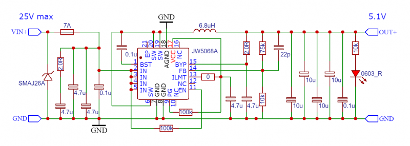 Зарисовал схему сгоревшего модуля, распиновка выводов микросхемы также соответствует JW5068: