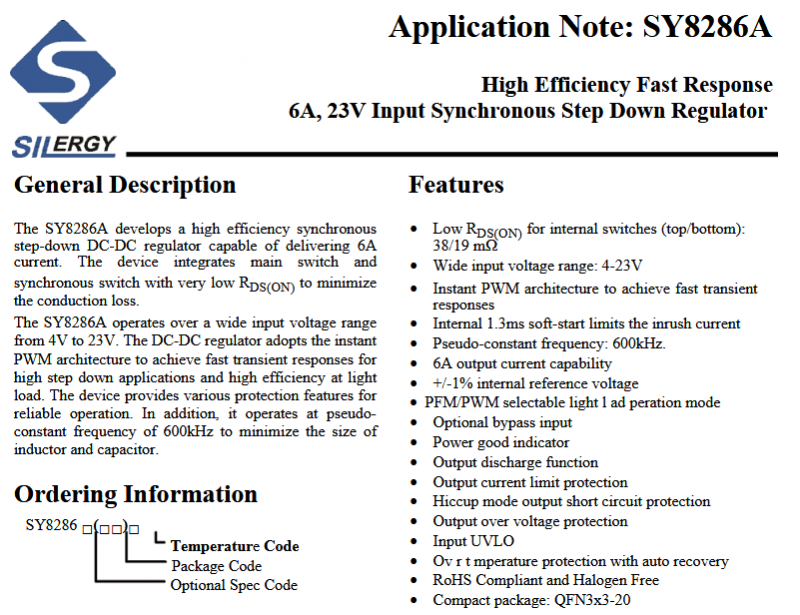 Уже после публикации обзора нашёл даташит на ещё один преобразователь — SY8286 от китайской Silergy Corporation:
