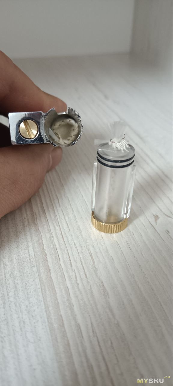 По задумке конструктора топливо через промежуточный фитиль равномерно пропитывает вату, а та отдает топливо основному фитилю (Zippo-подобный, как у всех бензинок). Заправляем.
