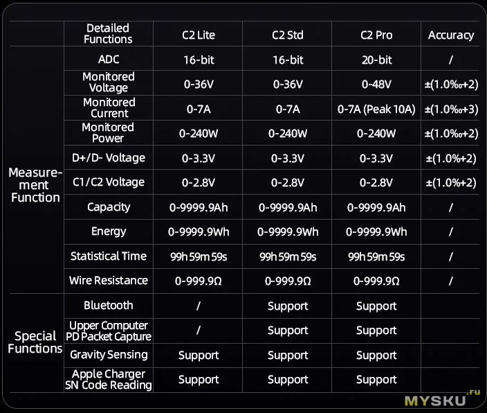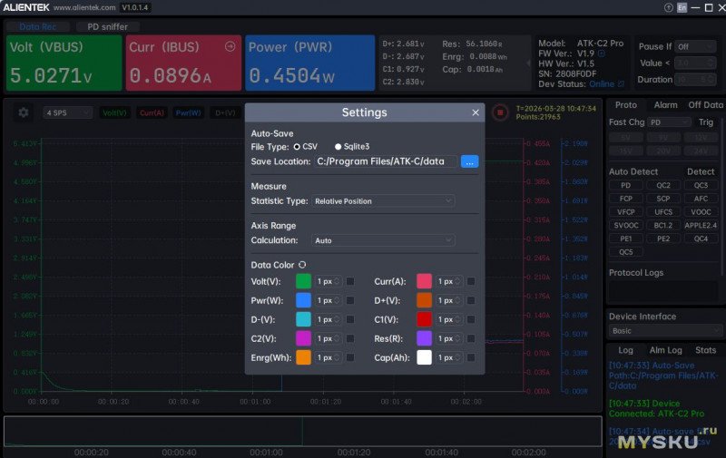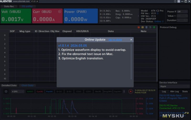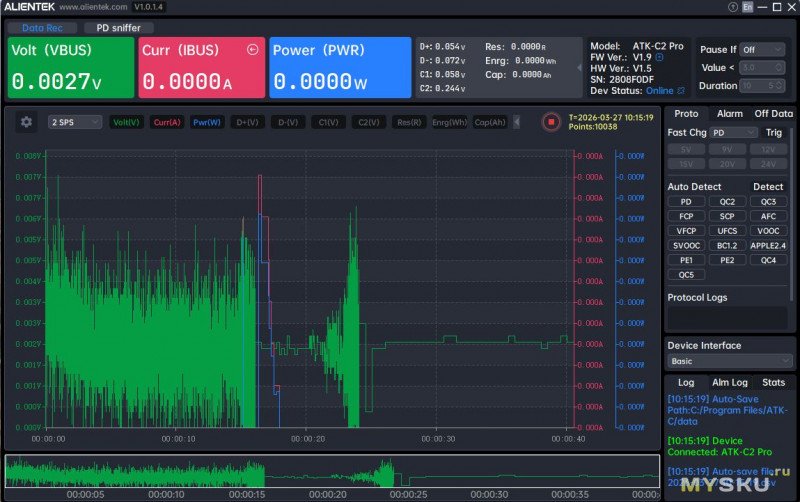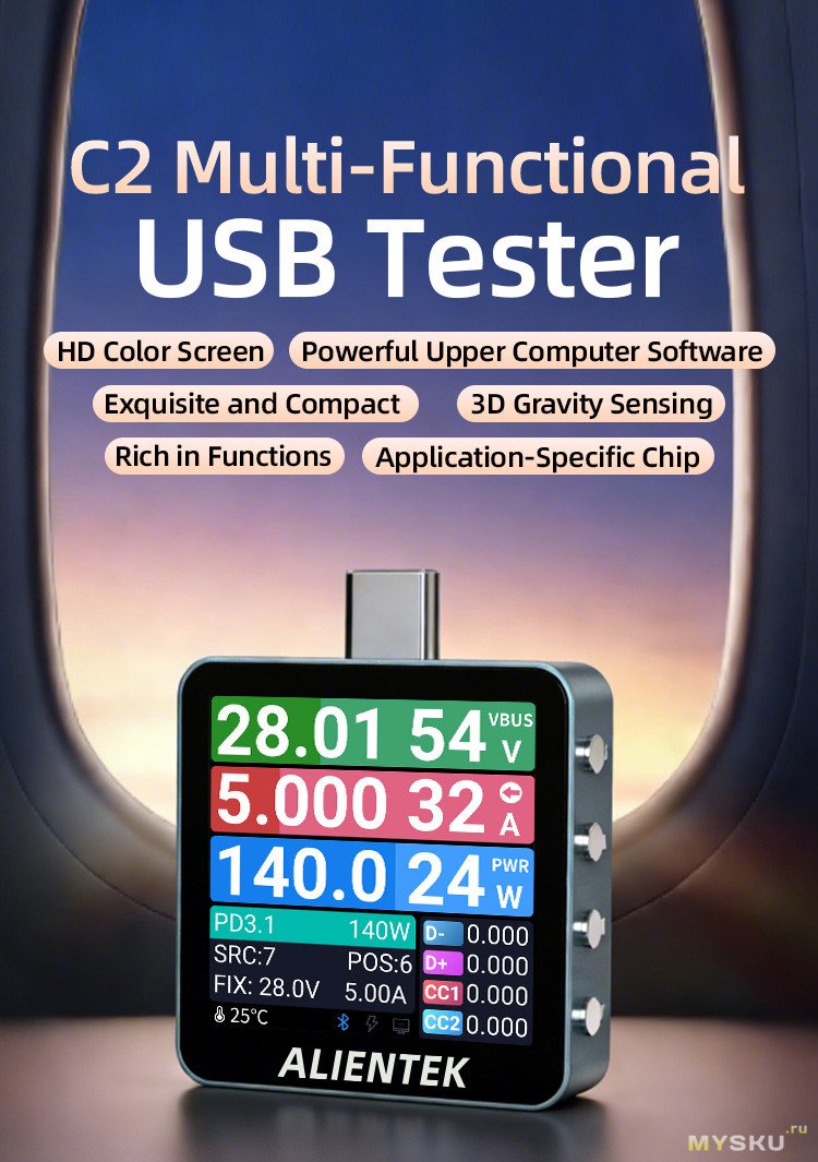 ALIENTEK C2 Pro — это многофункциональный современный USB‑тестер, который выходит далеко за рамки простого измерения напряжения и тока. Это уже инструмент для комплексного анализа USB‑устройств и кабелей. Тут яркий IPS экран, полная поддержка PD 3.2 и более 15 других протоколов быстрой зарядки, анализ пульсаций и возможность работы со смартфоном и ПК (поддержка трех ОС). Частота дискретизации 1000 Гц и 20‑битный АЦП обеспечивают высокую точность измерений (±(1%+2)) и быстрое обновление данных. Даже о защите экрана подумали.Из минусов: не понятно что с мобильным ПО, его точно стоит подтянуть, и, конечно, цена.
