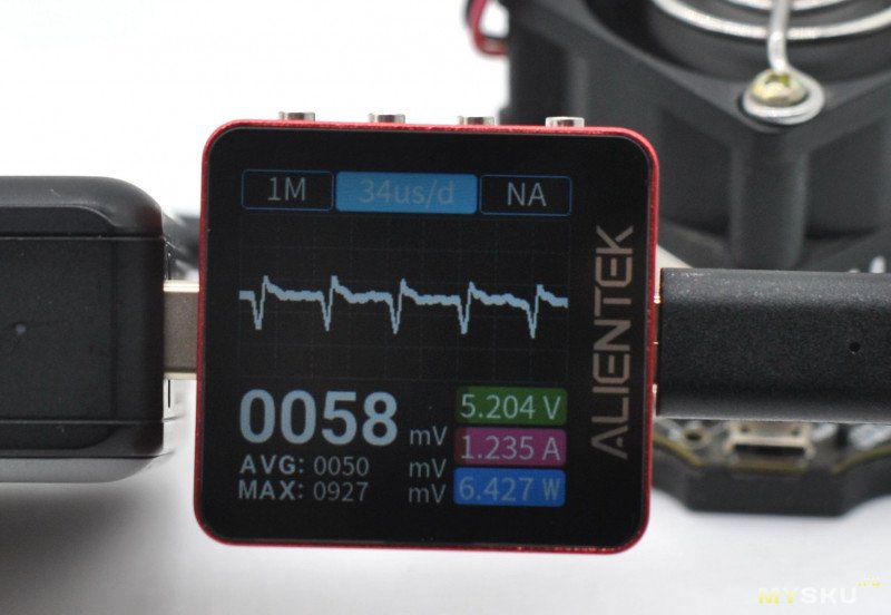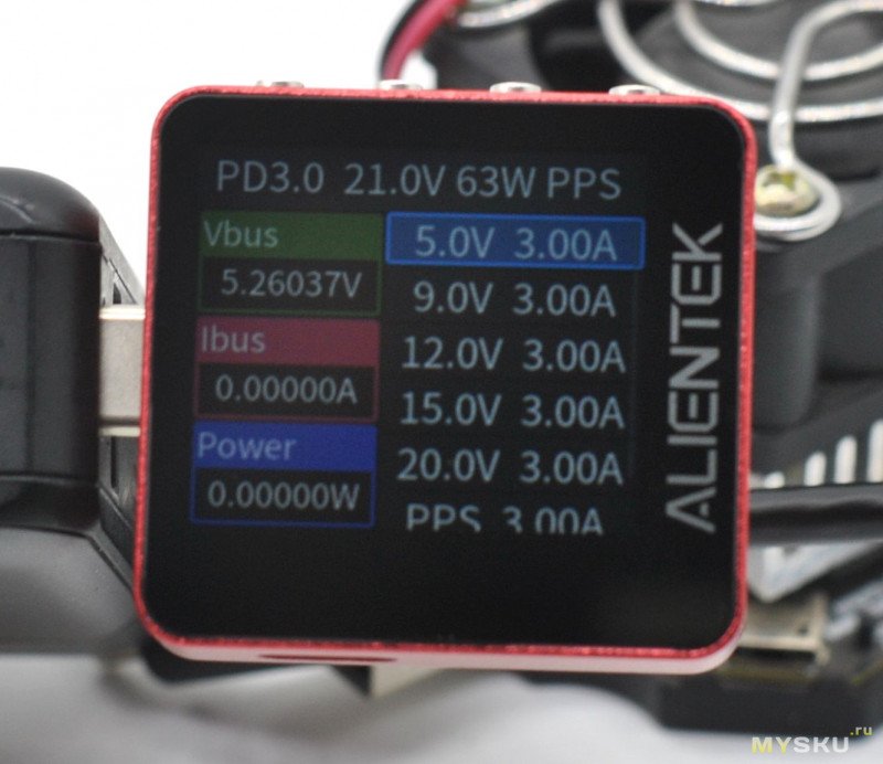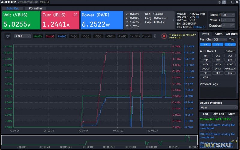 В Ryken запас по мощности немного выше, чем у обозреваемого (до 8 А или до 12 А в пике), активированный протокол зарядки определяется корректно, пульсации (без графика) можно видеть и на основном экране (или с графиком — на отдельном, как у всех), ну и PD 3.2 он уже тоже поддерживает