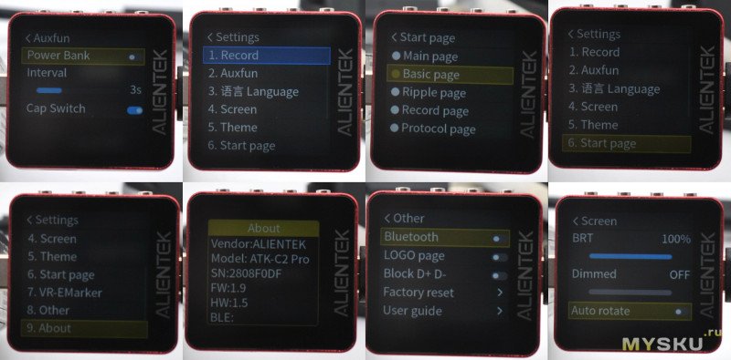 Можно выбрать экран, с которого будет включиться прибор, активировать режим Power Bank (тест без нагрузки), выбор цветовой схемы, отобразить QR-код с мануалом и версия ПО.