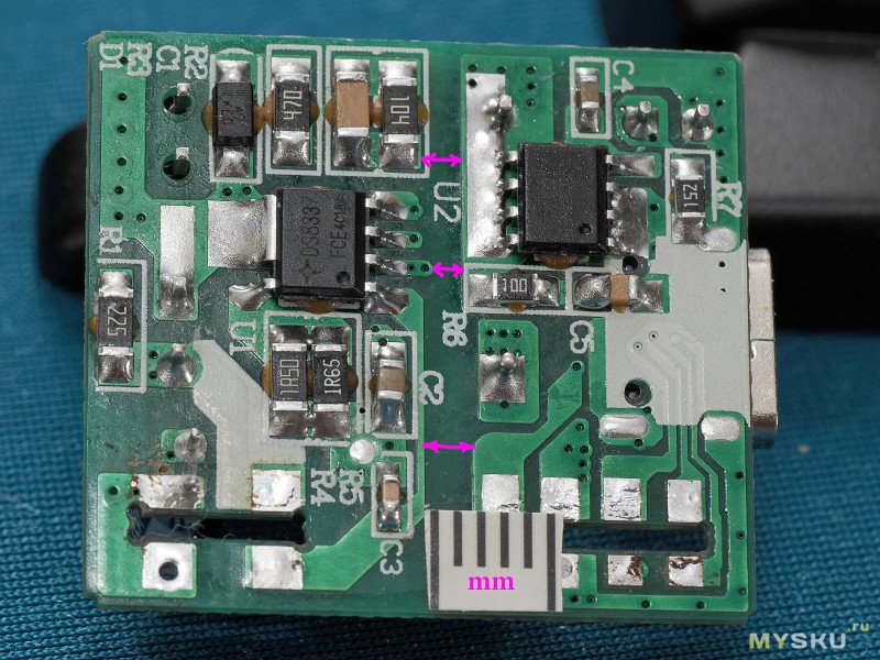 А что это? А это такой необычный SMD (!) китайский Y-конденсатор. Типоразмер 1206 у чип-резистора справа. Слева — резистор 0805. Сам конденсатор тут уже после испытаний, у него немножко отвалился один вывод.