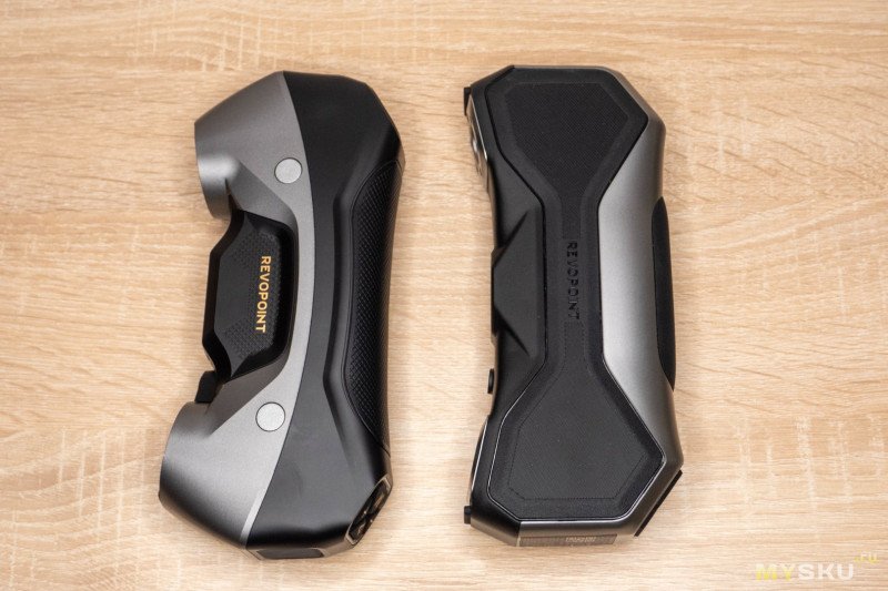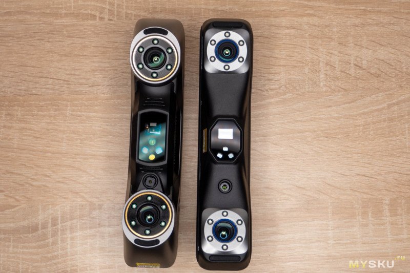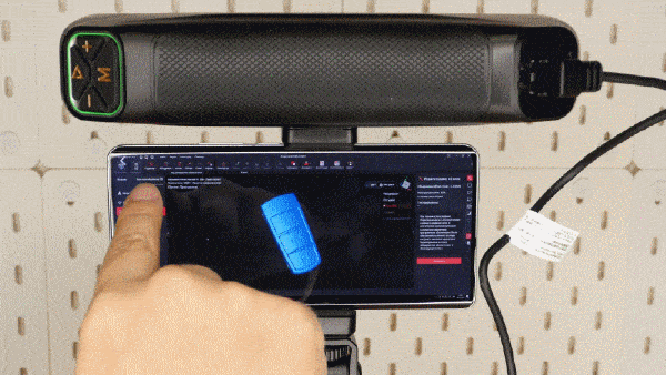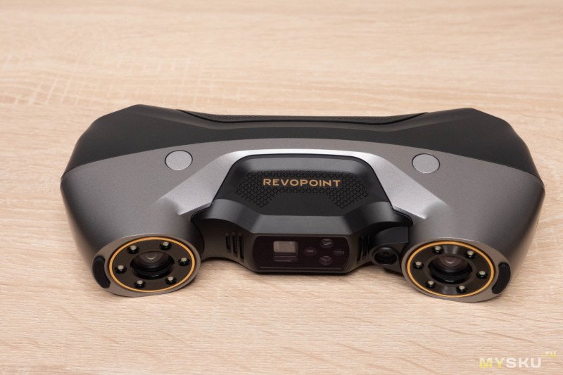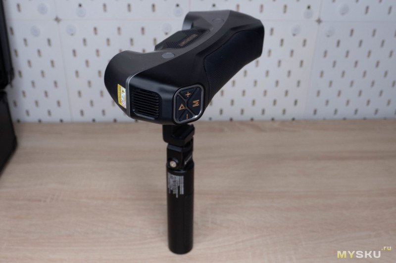 На переднем торце расположен сложный оптический блок: три камеры, крупное окно проектора и четыре лазерных излучателя, каждый отвечает за свой режим. С обратной стороны вынесли физические кнопки — они дублируют основные команды в софте, что очень удобно: можно ставить сканирование на паузу или менять параметры, не отвлекаясь на компьютер.