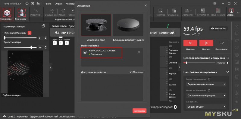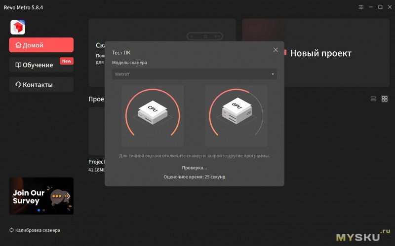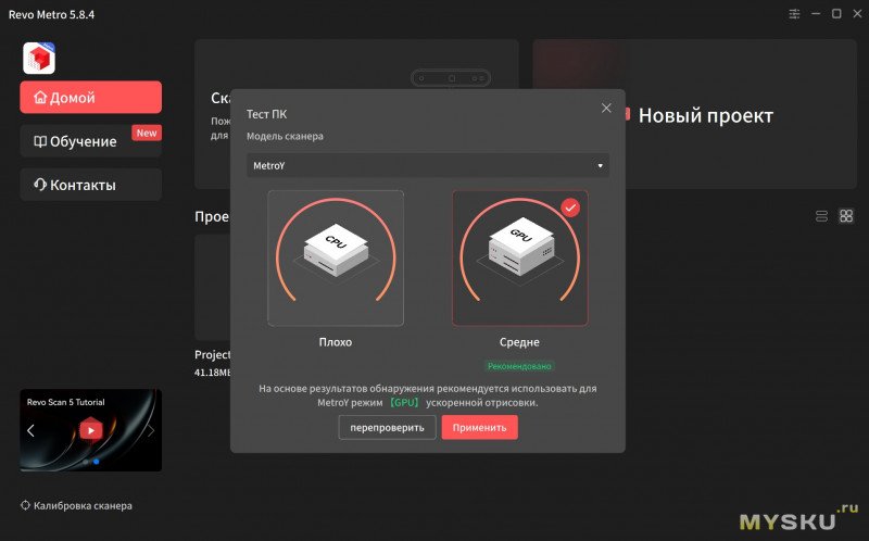 Для управления сканером нужна программа Revo Metro, которую можно скачать на официальном сайте. При первом запуске она проводит стресс-тест компьютера и выносит вердикт касаемо его производительности, после чего появляется выбор что использовать при обработке: процессор или видеокарту. У меня стоит RTX 4070, тест выдал «средний» результат, но по факту в работе карта грузилась от силы наполовину. Видимо, бенчмарк подстраховывается.