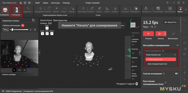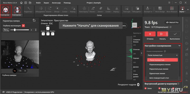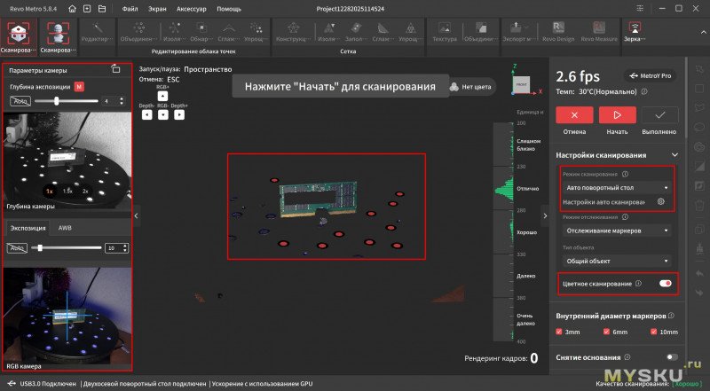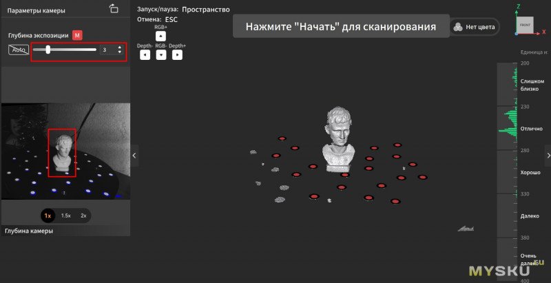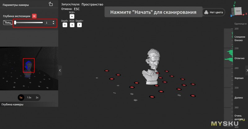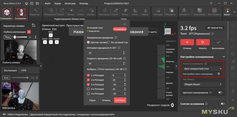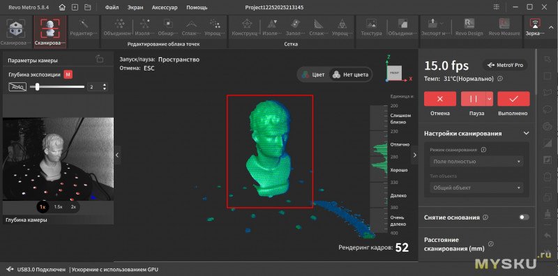 Если подключить автоматический стол, появляется ползунок включения цветного сканирования. Тут важно нормальное освещение, а экспозицию ИК и цветной камеры лучше выставить руками, чтобы баланс между геометрией и цветом был идеальным.