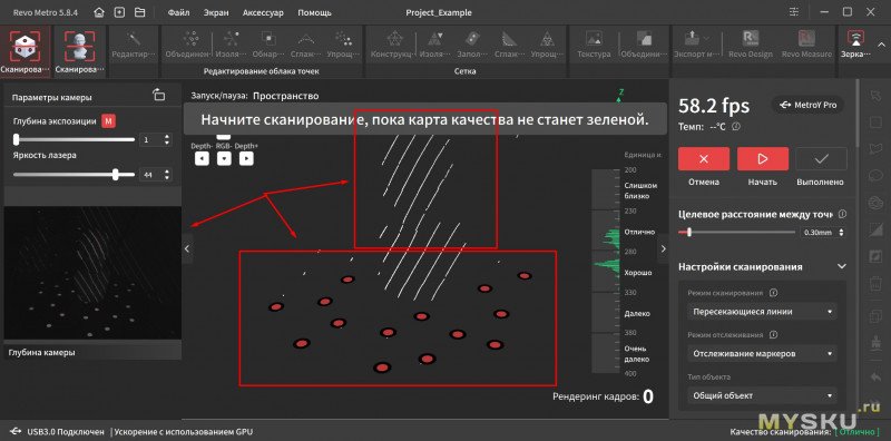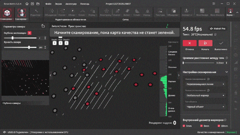 Для лазерных режимов в софте появляется ползунок яркости лучей и настройка целевого расстояния между точками. По сути, это просто ориентир: если поверхность «зеленеет», значит вы достигли нужной плотности сканирования.