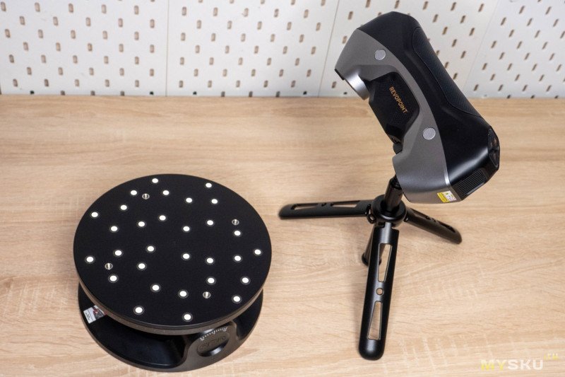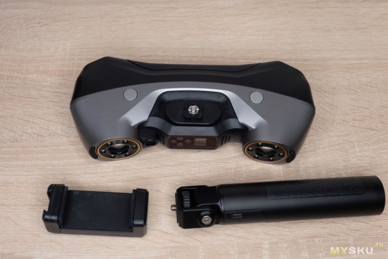 Для полной автономности можно использовать комплектный павербанк, к которому цепляется держатель для телефона с быстросъемным разъемом, ответная часть которого вкручивается в сканер. Рукоять при этом можно прикрутить к штативу — снизу есть резьба. Ну и при желании можно использовать любой павербанк, главное, чтобы он поддерживал протоколы быстрой зарядки до 18Вт.