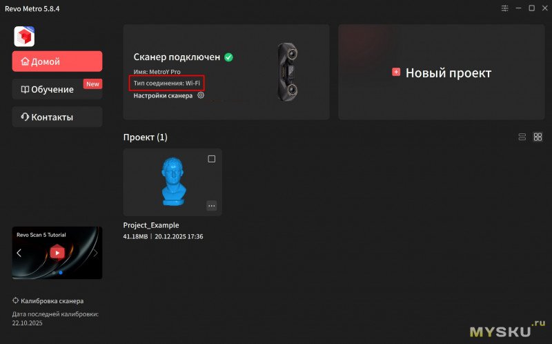 Главный экран встречает лаконичностью: видно, подключен ли сканер, можно продолжить старые проекты или запустить новый. В левом нижнем углу прячется кнопка калибровки с датой последней процедуры. Туда я советую лазить, только если что-то пошло не так.