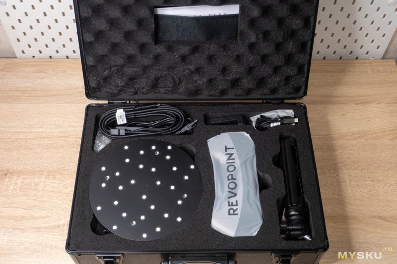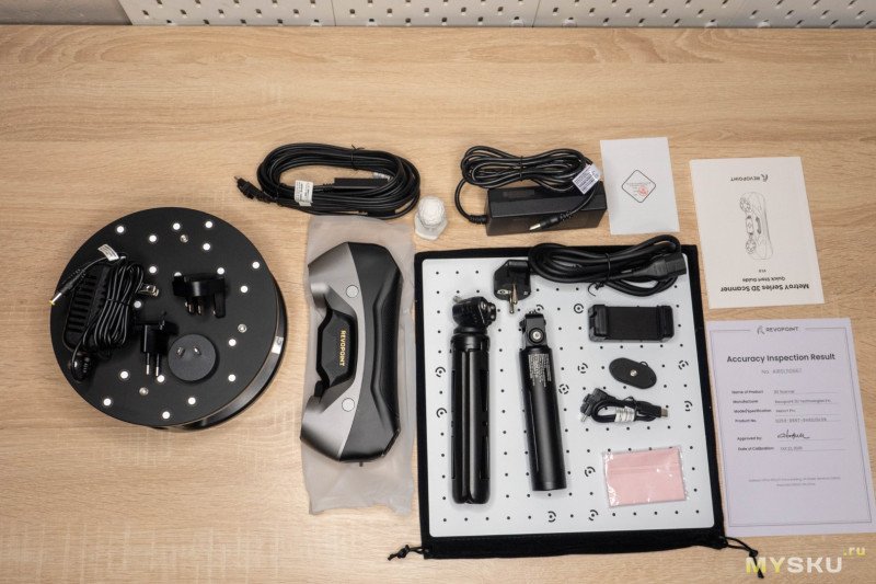 В моем случае версия «Pro», так что комплект максимальный. Помимо сканера, тут нашлось место компактному штативу, блоку питания, основному кабелю и эталонной стеклянной пластине для калибровки. Вишенка на торте — двухосевой поворотный стол, второй штатив, выполняющий заодно роль павербанка, клипса для смартфона и короткий провод. Из макулатуры гарантия и мануал. А в потайном кармашке обнаружилась пачка листов с маркерами-наклейками (200 штук).