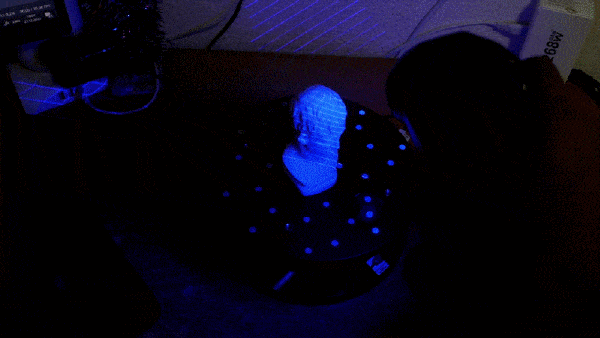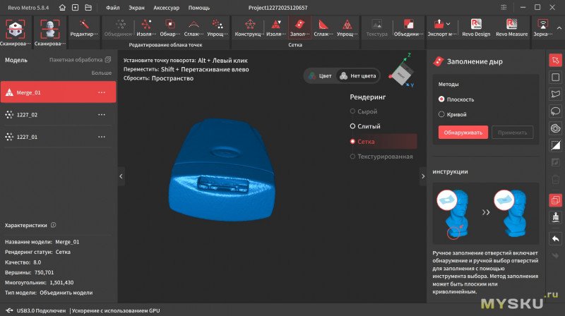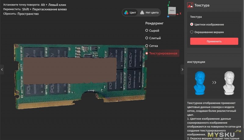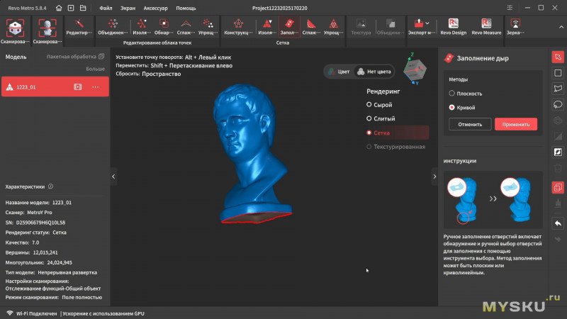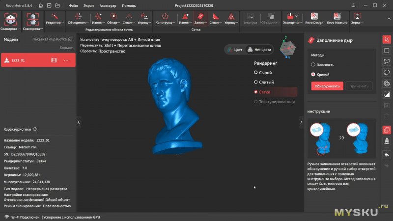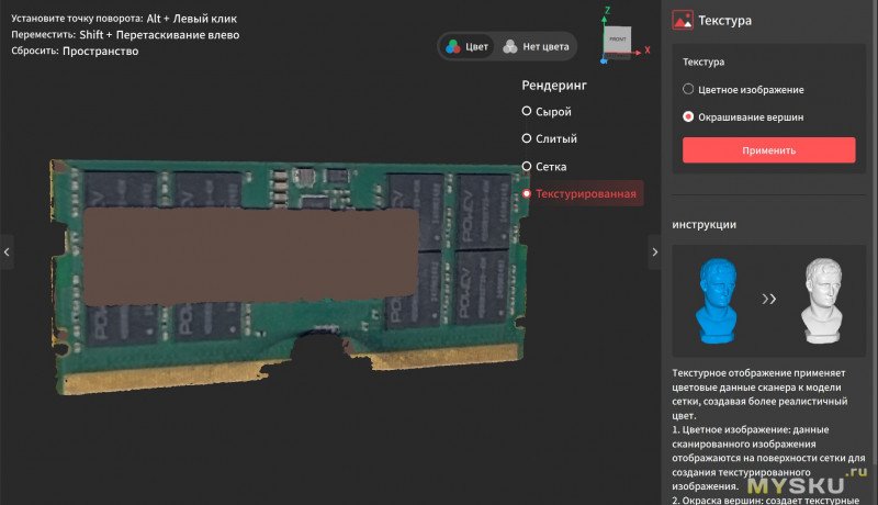 Включаем поворотный стол, запускаем съемку и сканер начинает сохранять по 15 стереокадров в секунду. Если у объекта есть сложные нависания, ставим процесс на паузу, меняем угол, и система сама «привяжет» новые кадры к уже готовой геометрии. Формируемую в центре проекцию можно вращать и увеличивать для анализа качества сканирования. Если нет видимых дефектов, жмем кнопку «Выполнено».