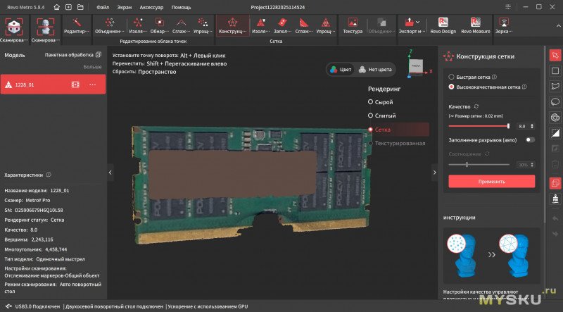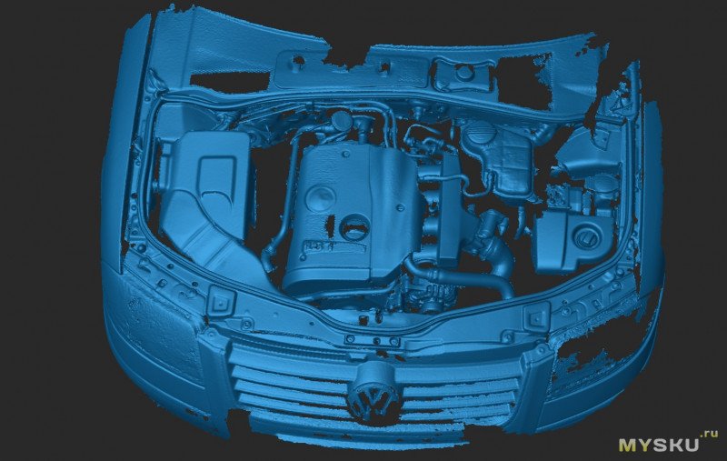 Самый маленький сканируемый объект может быть размером 10x10x10 мм (для примера на снимке монета), максимальный указан 1х1х1 метр, но фактически площадь ограничена только оперативной памятью. Самое быстрое и щадящее сканирование делается с помощью текстурированного света(пара тысяч кадров на часть авто), но тут нужен матирование или хотя бы пыль(как в моем случае), чтобы не бликовало.