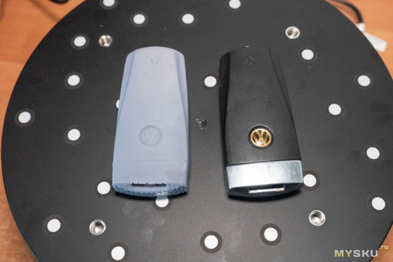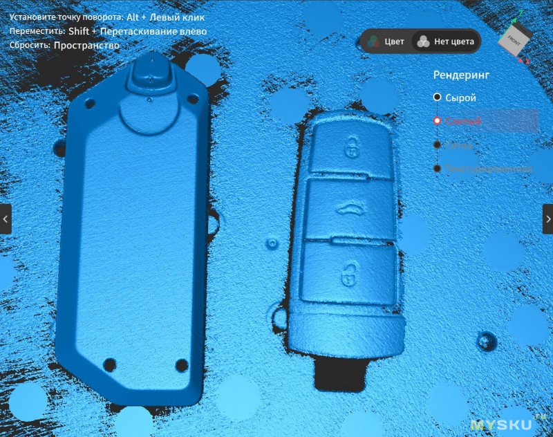 Будем использовать брелок, с которым выше были проблемы. Никакой механической обработки и матирования. Режим: пересекающиеся линии, тип объекта: черный. Идеально было сканировать его вертикально, но он падал, так что положил горизонтально. Из-за того, что на верхней грани было много хрома, она «закрашивалась» медленнее и пришлось уделить ей больше времени.