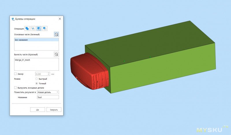 Поэтому выбрал ручной режим. Необходимо указать несколько точек, где модели должны совпадать до тех пор, пока в окне превью справа не сформируется полноценная деталь. В моем случае хватило трех точек.